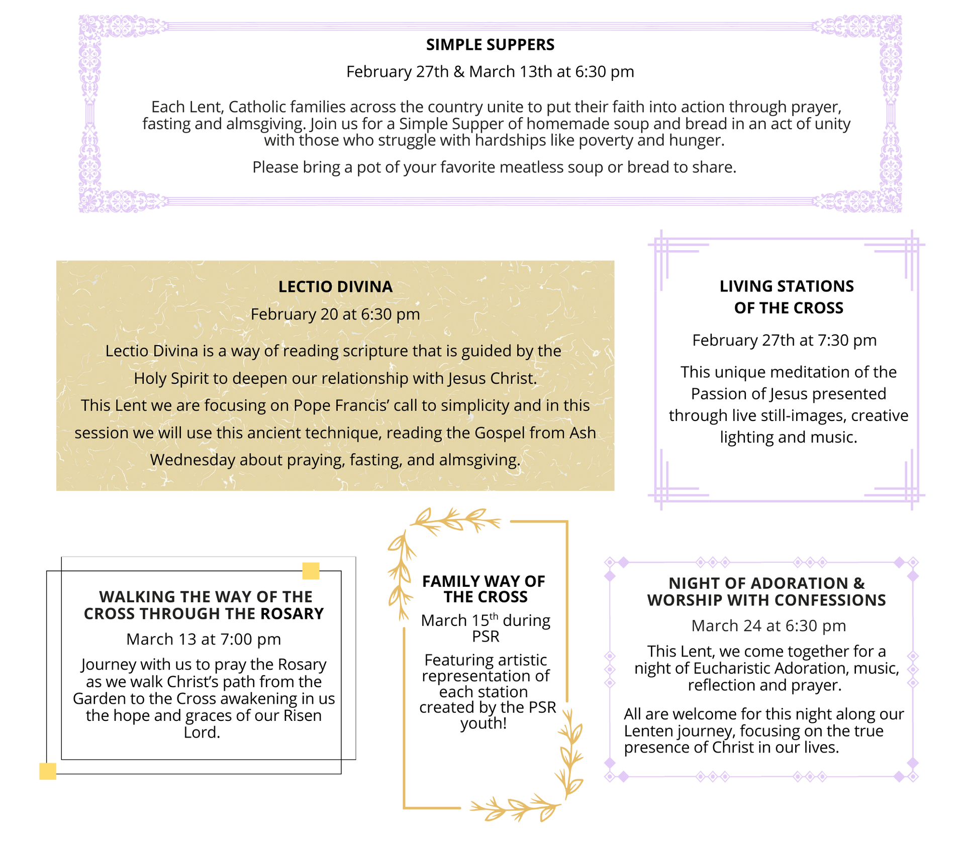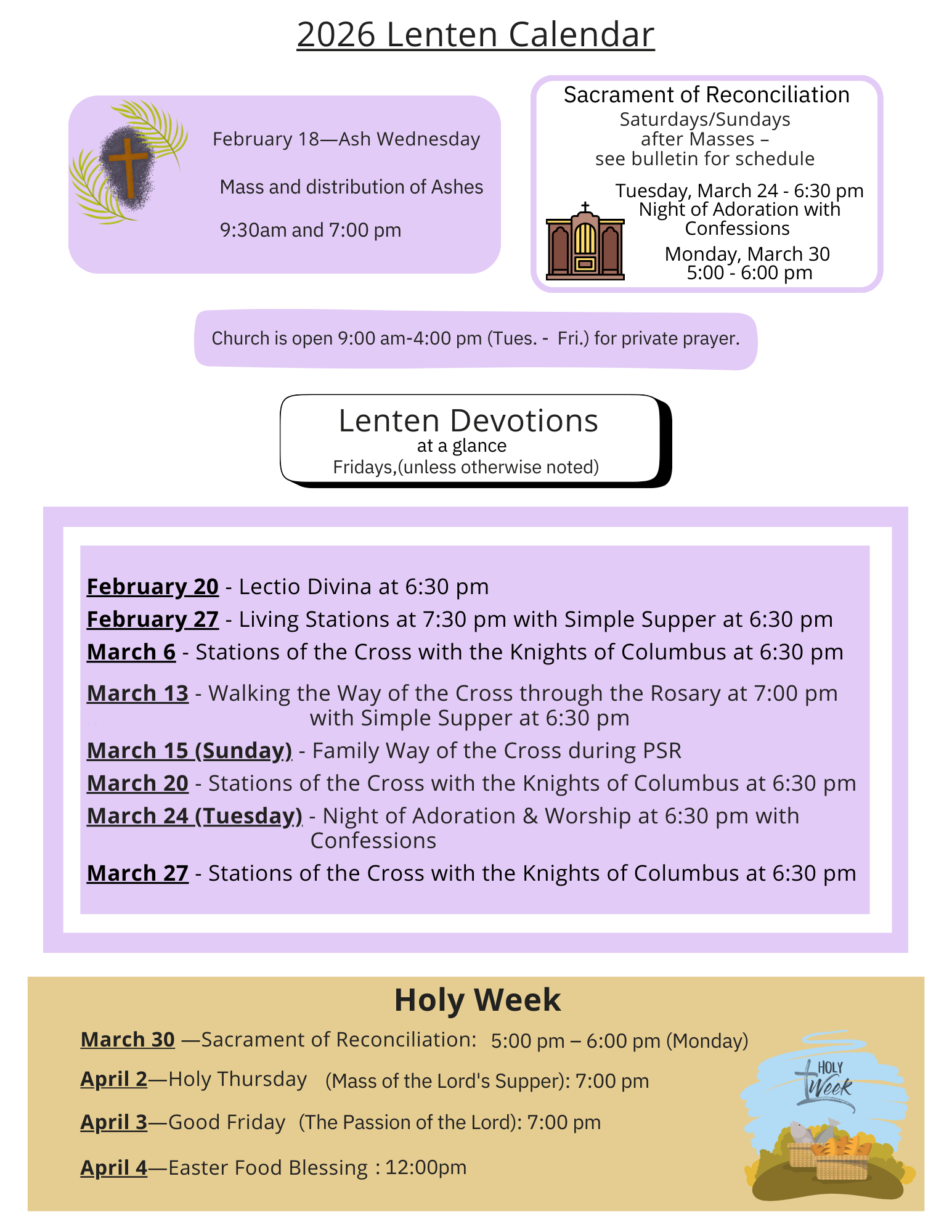 Ash Wednesday is February 18th. We will be distributing ashes during the masses at 9:30 am and 7:00 pm.