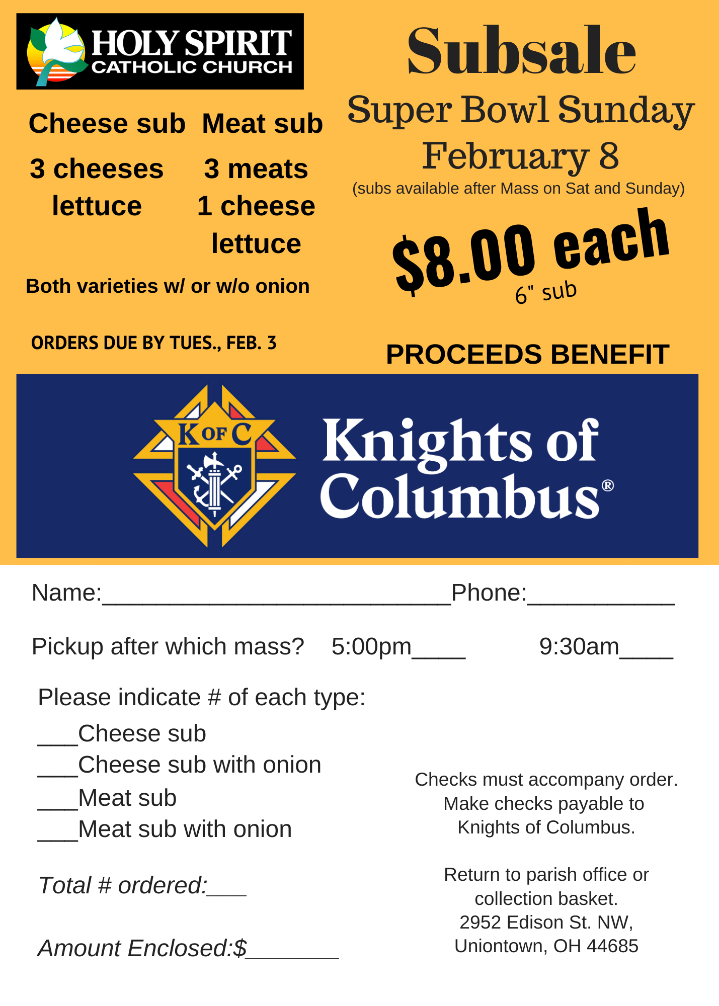 Our Knights of Columbus will be taking orders for Superbowl sub sandwiches, made by and benefitting the Knights of Columbus, for the next two weeks after Mass.